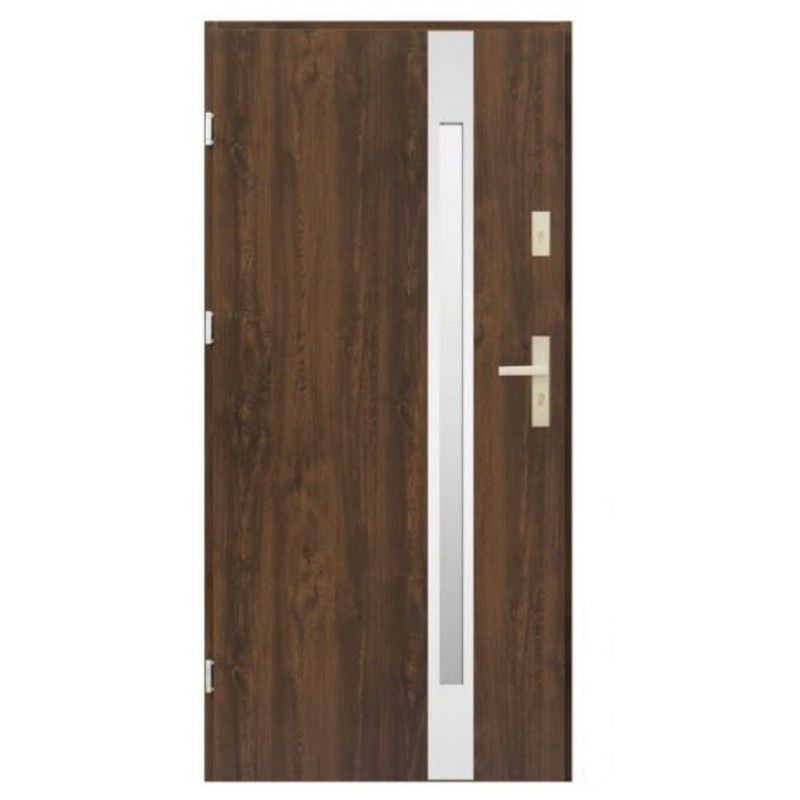 L'ouvrant est équipée de 3 goupilles anti-levier. Le cadre de la porte est constitué de profilés en acier galvanisé recouverts d'un stratifié ressemblant au bois.