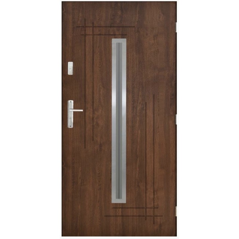 L'ouvrant est équipée de 3 goupilles anti-levier. Le cadre de la porte est constitué de profilés en acier galvanisé recouverts d'un stratifié ressemblant au bois.