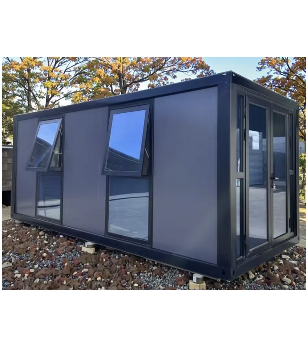 Sur ce modèle, la façade latérale présente deux larges fenêtres oscillo-battantes ainsi qu’une baie vitrée d’angle avec porte intégrée, offrant une ouverture généreuse sur l’extérieur et un apport lumineux maximal. Les surfaces vitrées et les contours sombres renforcent son style contemporain et élégant.