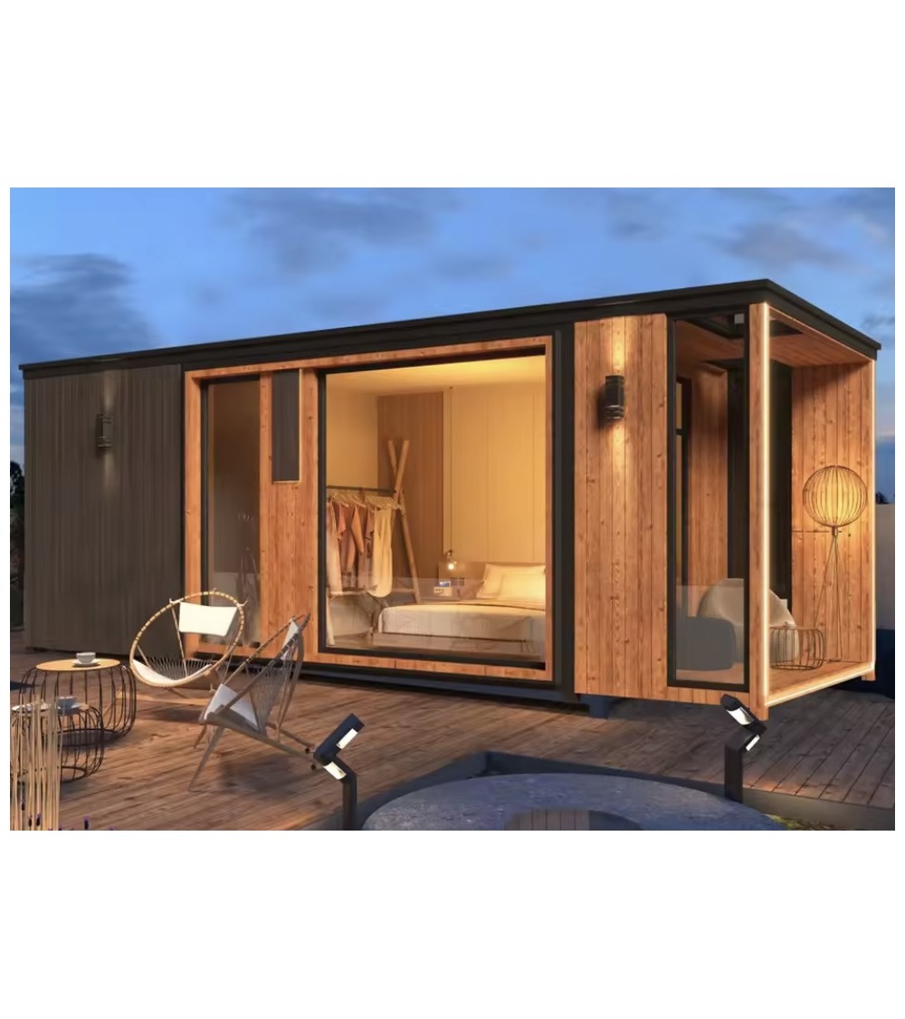 Le Container PR1 séduit par son allure haut de gamme grâce à son parement en bois naturel et ses larges surfaces vitrées encadrées de structures métalliques noires. L’association du bois chaleureux et du verre moderne crée une esthétique élégante et contemporaine.