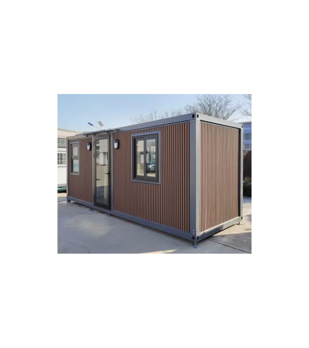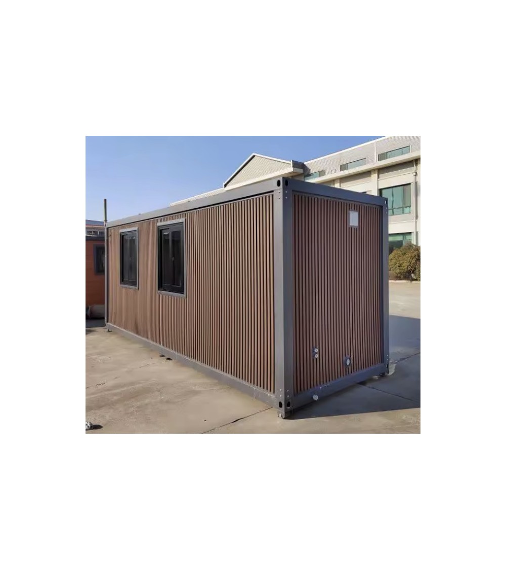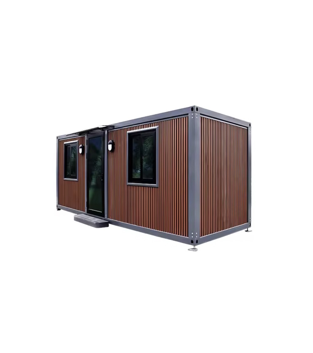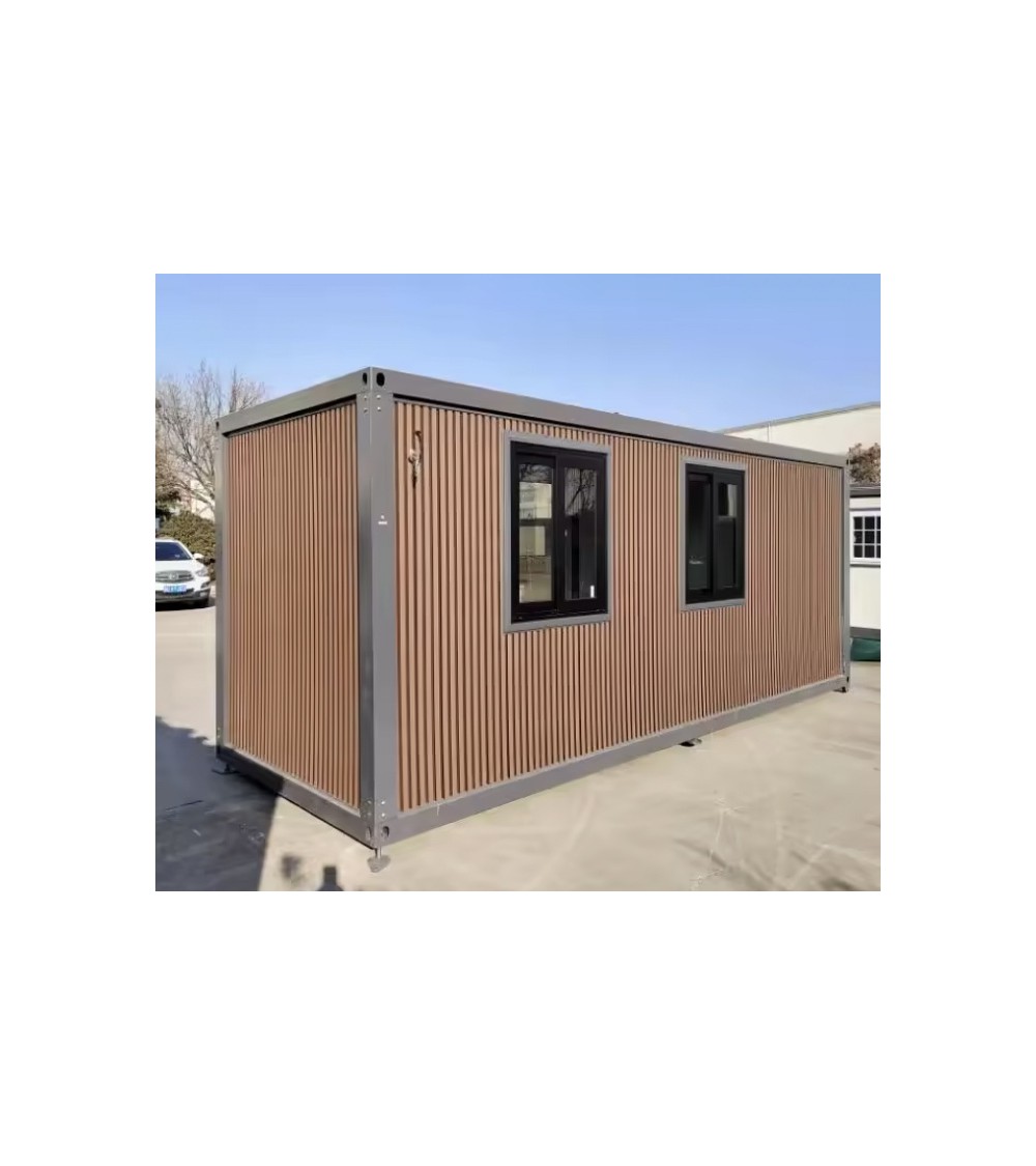 Le Container PR2 séduit par son esthétique moderne grâce à son parement effet bois à lames verticales, subtilement encadré par une ossature métallique gris anthracite qui met en valeur ses lignes contemporaines.