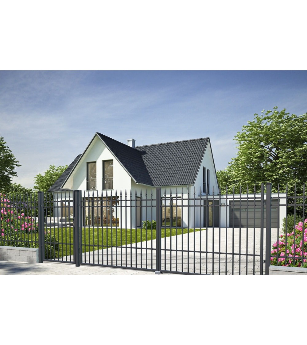 PORTLAND est une beau portail avec une ligne droite, finie avec de fines pointes de flèches de couleur anthracite, en plus décorée d'une fine structure. Le produit est protégé contre la corrosion par galvanisation et a une haute résistance aux intempéries et à la décoloration.