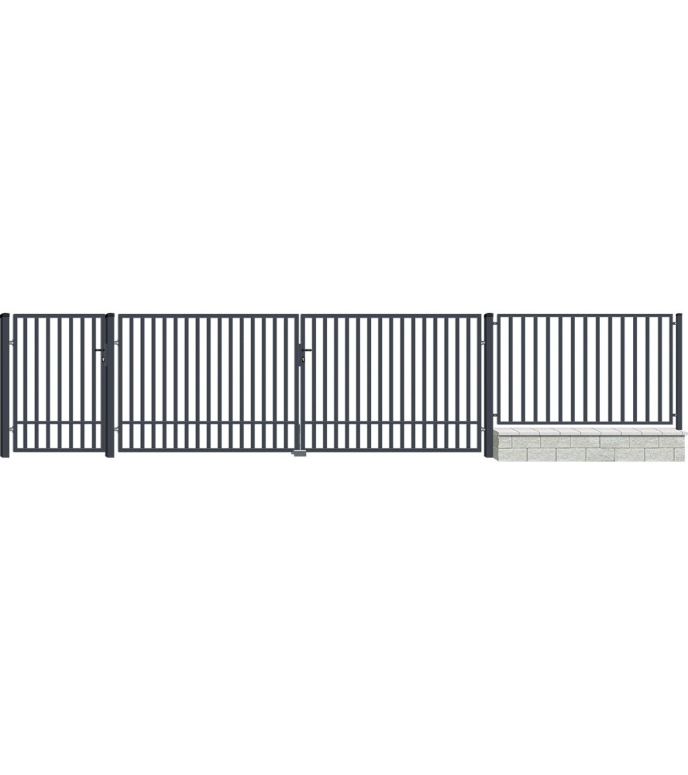 SALVADOR est un portail modern avec une structure simple. La clôture a été peinte en anthracite, en plus décorée d'une structure délicate, créant un ensemble extrêmement élégant. Le produit est protégé contre la corrosion par galvanisation et a une haute résistance aux intempéries et à la décoloration.
