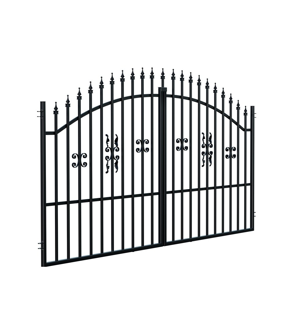 Eliza III est un portail classique décoré d'éléments forgés subtils et d'un profil arqué. La clôture a été galvanisée et enduite de poudre noire, elle ne nécessite pas de protection anti-corrosion.