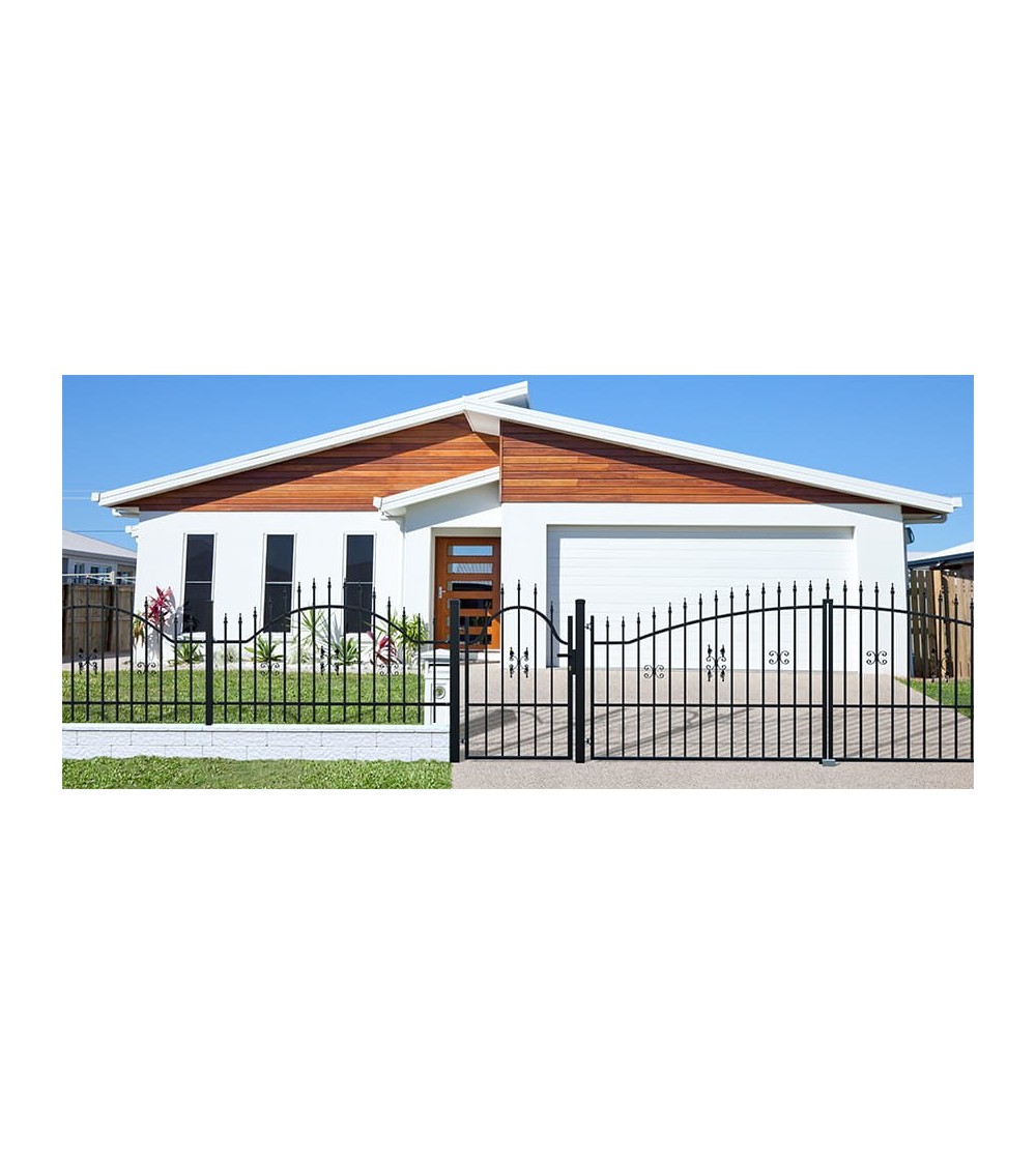 Eliza III est un portail classique décoré d'éléments forgés subtils et d'un profil arqué. La clôture a été galvanisée et enduite de poudre noire, elle ne nécessite pas de protection anti-corrosion.