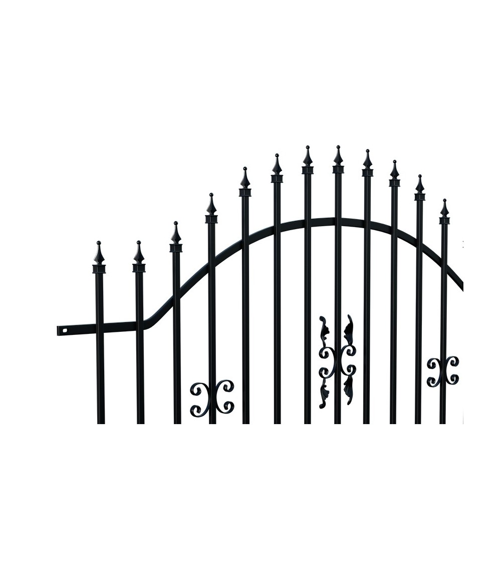 Eliza III est un portail classique décoré d'éléments forgés subtils et d'un profil arqué. La clôture a été galvanisée et enduite de poudre noire, elle ne nécessite pas de protection anti-corrosion.