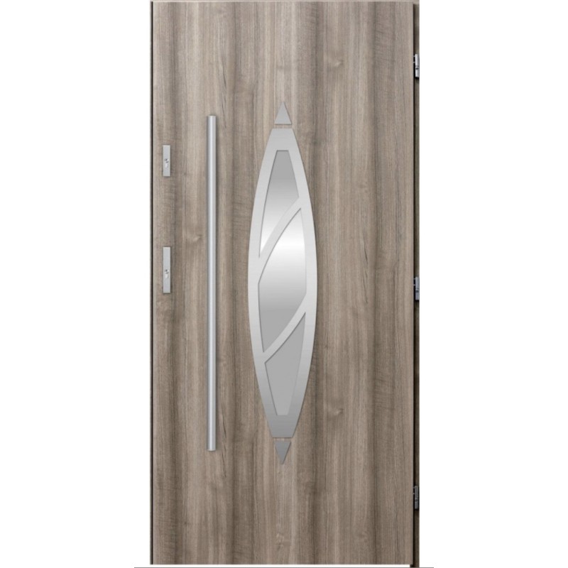 Porte extérieure de 55 mm d'épaisseur composée d’acier inoxydable. La structure est remplie d'une plaque de mousse polyuréthane et de bois possédant de très bonnes propriétés isolantes et acoustiques.