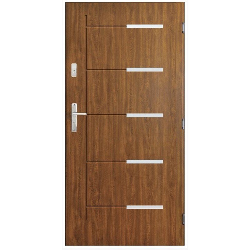 L'ouvrant est équipée de 3 goupilles anti-levier. Le cadre de la porte est constitué de profilés en acier galvanisé recouverts d'un stratifié ressemblant au bois.