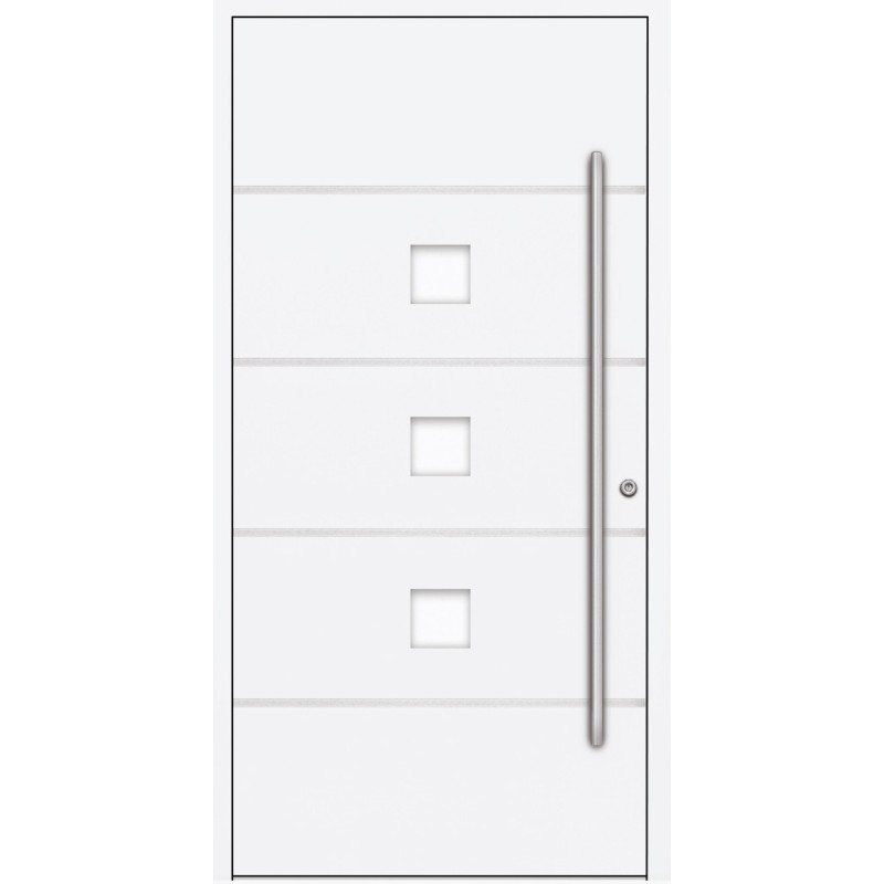 - Accessoires inclus : vantail et cadre en aluminium, seuil à rupture de pont thermique, rosace résistante aux intempéries, trois charnières renforcées avec réglage complet dans trois plans